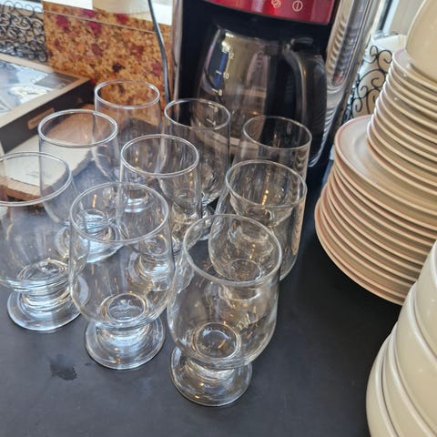 12 Rosendahl glass , godt brukt men mye bruk igjen,servering fat , ildfast form ( godt brukt) , 2 små kasseroller(godt brukt)2 eggeglass ,plastkopper,beholder til bestikk ect, mikrofiber kluter, såpe dispenser og lampe. Gies bort samlet. Hentes snarest ☺️ ta med deg en kasse eller noe til å ha tingene i, vil pakke inn glass slik at det ikke blir knust