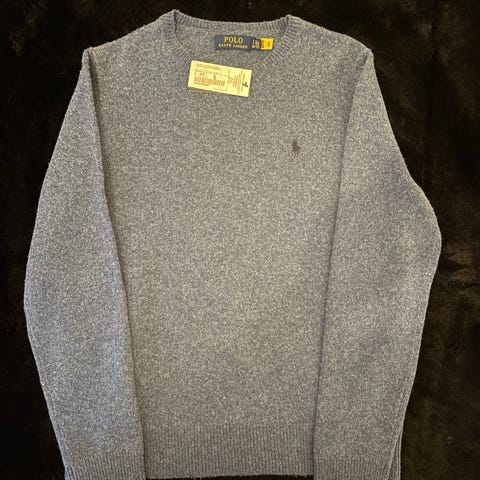 Polo Ralph Lauren genser for herre i størrelse medium. Genseren er mørk grå og laget av 100 % merinoull. Den har rund hals, lange ermer og ribbestrikkede kanter i hals, ermer og nederkant. Diskré logo brodert på brystet. Pent brukt, noen nupper og er lite hull under ene ermet (se bilde). Varm og pen.