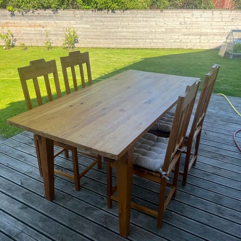 Brukt spisebord og stoler selges som de er. Enda mye bruk igjen, selv om man kan se at det er brukt. Pris ka diskuteres ved snarlig henting.