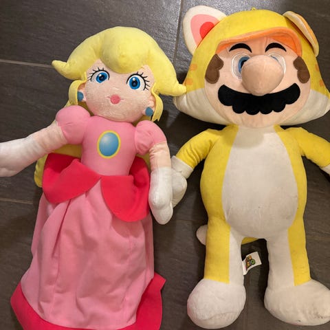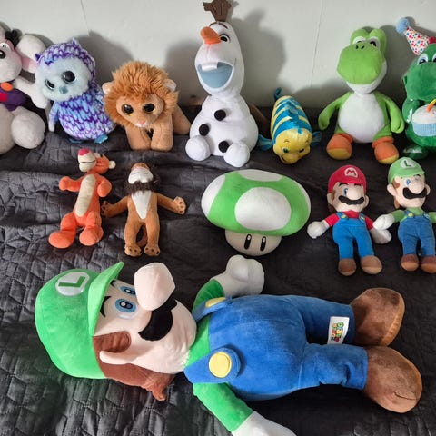 Super Mario kosedyr-samling med flere figurer fra Super Mario-universet. Blant figurene er Mario, Luigi, Peach, Yoshi, Donkey Kong, Bowser, Mini Bowser, Bob-omb og ulike fiender/biroller.