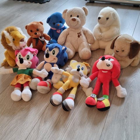 Myke kosedyr som kan brukes til lek, samling eller som pynt på barnerom. Størrelser og materialer varierer mellom figurene.