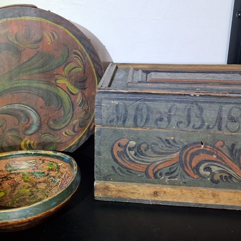 Ølhøne, kjenge, trøys, hengeskap, fremskap, ølbolle, kiste, antikk, bondeantikvitet.