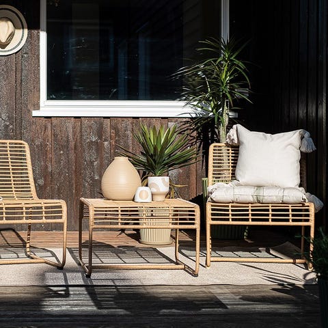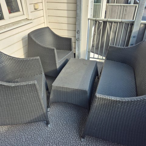 Rotting lenestol, sofa og bord med glassplate i naturfarget materiale. Stolen har høy rygg med vertikale rottingstaver og buede armlener. Passer til bruk inne eller i overbygde uteområder som vinterhage, balkong eller terrasse. Klassisk rottingdesign som kan kombineres med puter for økt sittekomfort. Dette settet er gammelt.
