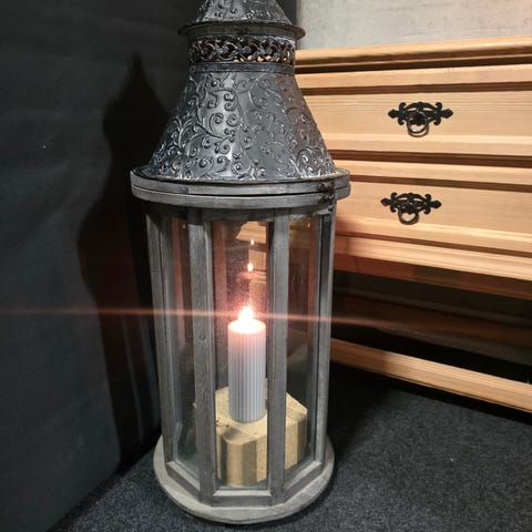 Stor dekorativ lanterne i tre og glass med metalltopp. Lykten har hvitmalt ramme med kryssprosser i glasset på alle sider og sort metalloverdel med luftespalter. Lokket kan åpnes fra toppen for plassering av lys eller dekor. Egnet til bruk innendørs eller under tak utendørs, for eksempel på bord, gulv eller i gang.