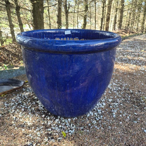 Selger en blå blomsterpotte med jord. 32 -33 sm