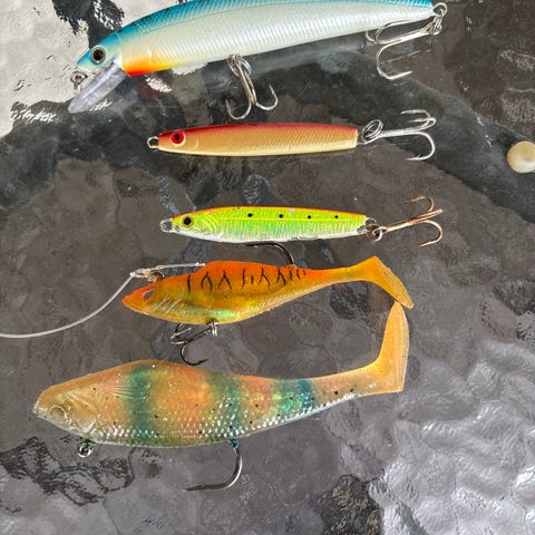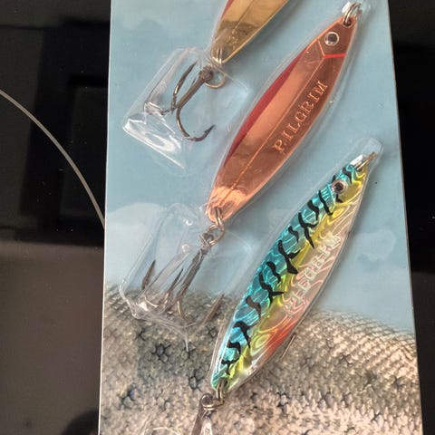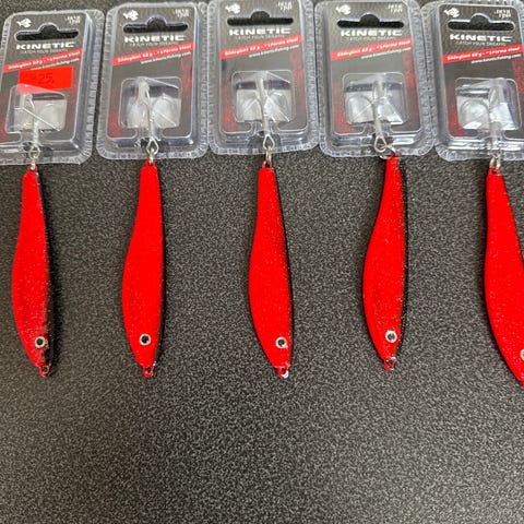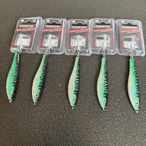 Kinetic sluksett bestående av flere sluk i ulike størrelser. Slukene har hvit kropp med blå og grønne detaljer, samt røde markeringer ved hodet. De er utstyrt med treblekroker og er egnet til fiske etter ulike arter i både ferskvann og saltvann, avhengig av vekt og rigging. Settet gir variasjon i størrelse og fargevalg for tilpasning til forskjellige forhold.