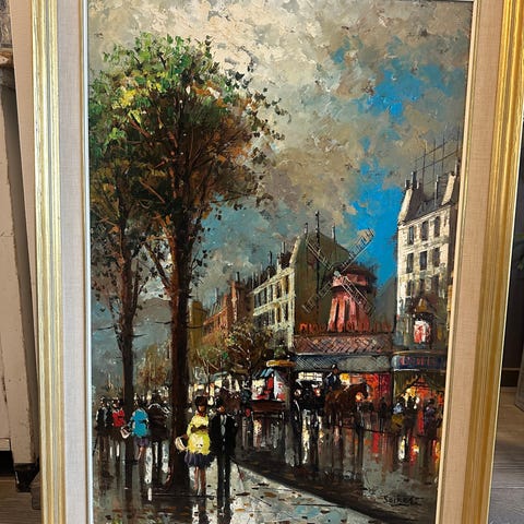 Eldre oljemaleri av den danske kunstneren Lis Bjergsted. Gateotivet er fra København med Det Runde Tårn i bakgrunnen. Se ellers foto av informasjon som er festet på blindrammen. Rammen har fått et par dulter her og der, men behøver ikke byttes. Maleriet er ellers i god stand. Det har vært i familiens eie i i mange, mange år, men selges nå i forbindelse med rydding. Yttermålene med rammen er 83 x 73 cm. Selve maleriet måler 64 x 55 cm.