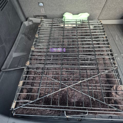 Robust metall hundebur med plastbunn leies ut.