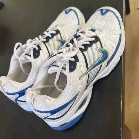 Nike løpesko i størrelse 44. Skoene er i hvit farge med svart Nike-logo på siden. Overdelen er i pustende mesh-materiale med snøring foran. Yttersålen har gummimønster for grep. Egnet til løping og annen trening utendørs og innendørs.