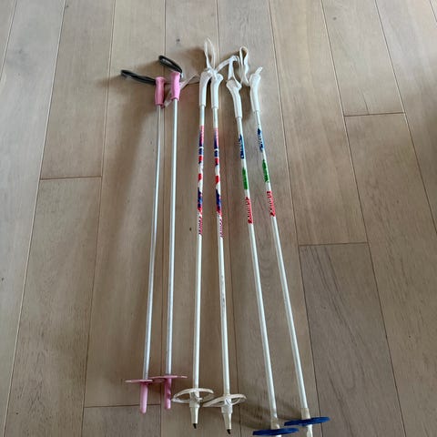 4 par langrennsski og 6 par staver i ulike lengder til barn. Rottefella-bindinger på alle skiene. Sender ikke i posten.