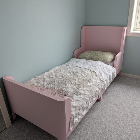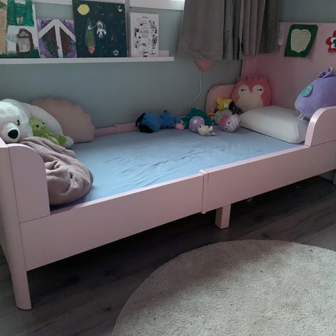 IKEA juniorseng i rosa farge. Sengen har sengehest på begge sider og er tilpasset barn i overgang fra sprinkelseng til vanlig seng. Sengen kan endres lengde på. Følger med madrass. Har også et klesskap i samme serie som er ubetydelige brukt. Selges kr 300,- for seng og 300,- for skap.