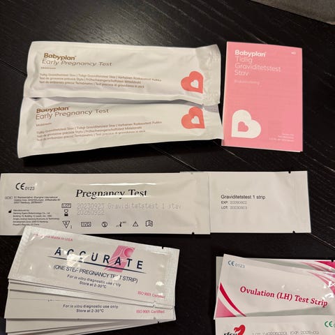 Stor pakke med eggløsningstester, graviditetstester, og kosttilskudd selges.