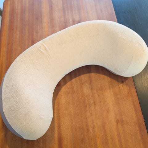 Ergobaby ammepute i grå tekstil. Puten har buet fasong som legges rundt kroppen for støtte ved amming. Den har fast kjerne som gir stabil støtte til barnet og avlaster skuldre og armer for den som ammer. Yttermaterialet er i tekstil, med justerbar stropp for å holde puten på plass rundt livet. Egnet til bruk ved amming av spedbarn, både hjemme og på reise.