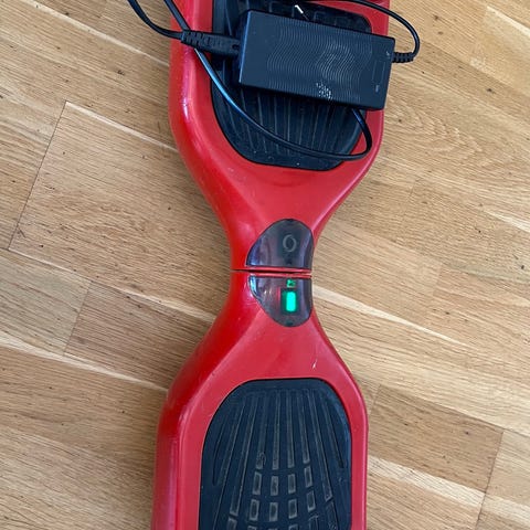 Elektrisk selvbalanserende brett med to hjul og fotplater med sklisikkert belegg. Hoverboardet drives av innebygd oppladbart batteri og lades med medfølgende lader (vist på bilde).