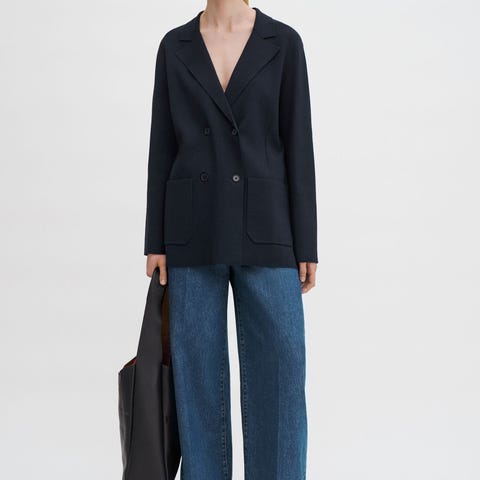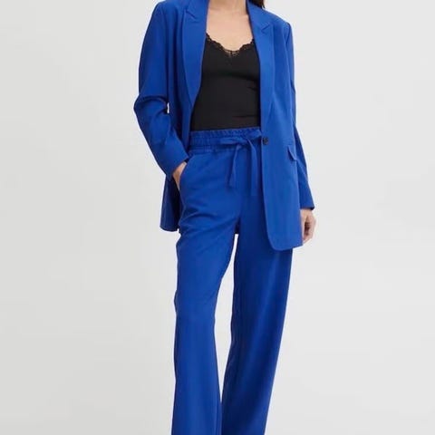 Vero Moda jakke for dame i størrelse L. Modellen har kort lengde med bred krage og dobbeltspent knappelukking foran. Jakken er kun brukt et par ganger