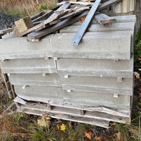 Naturstein murstein i lys grå farge. Steinene er rektangulære og varierende i lengde og bredde, egnet til for eksempel murer, kantstein, bedavgrensning eller andre uteprosjekter. Leveres som løse steiner stablet på pall eller bakken, klare for videre bearbeiding og montering etter behov.