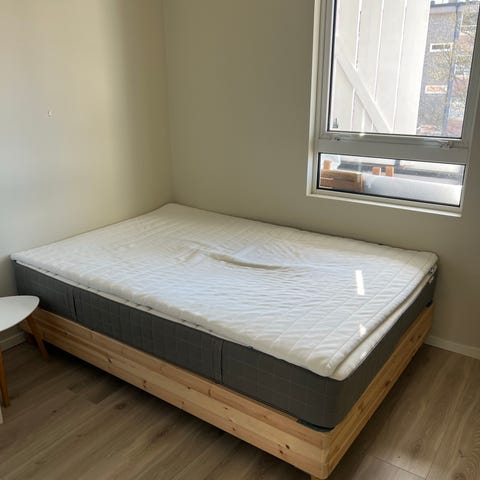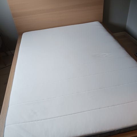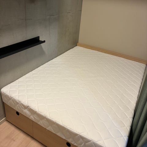 Selger en pent brukt Malm seng fra IKEA, str 140x200, kjøpt for 2 år siden. Stått på gjesterom, så minimalt brukt. Madrasser kan følge med om ønskelig, men overmadrassen har noen svake flekker. Har ikke prøvd flekkfjerning. Nypris for seng, ribbebunn, skuffer, madrasser og overmadrass er 6800kr. Selges for 3000kr, evt bud.