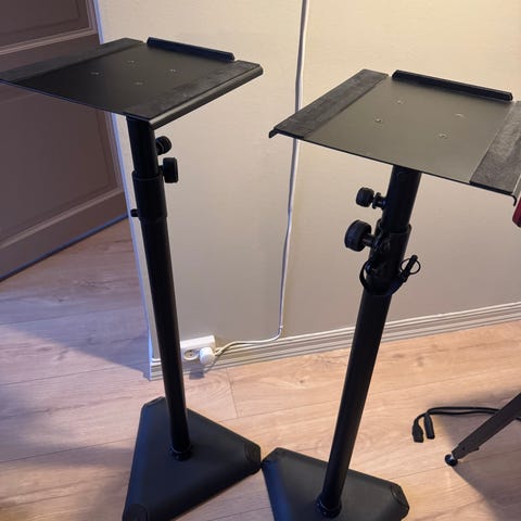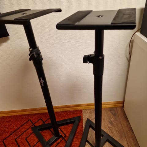Stativene har justerbar høyde og stabil trekantfot som står stødig på gulvet. Passer fint til hjemmestudio eller hi-fi.