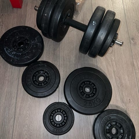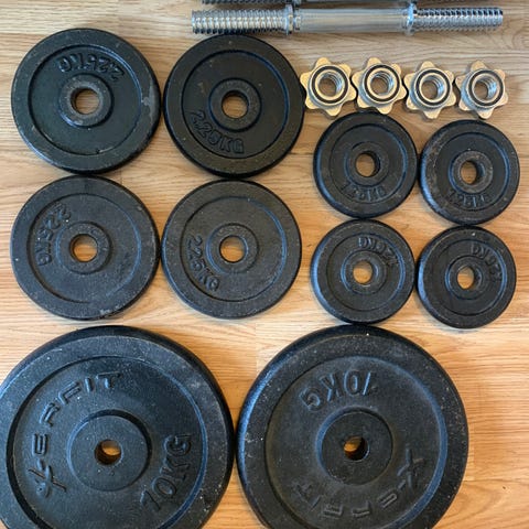 • vektskiver 2 × 10 kg, 2 × 5 kg, 2 × 2,5 kg, 2 × 1,25 kg