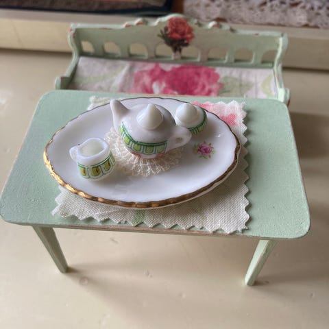 Sett møbler i blått, møblene er ikke tatt ut av plasten , selve pappesken er noe slitt