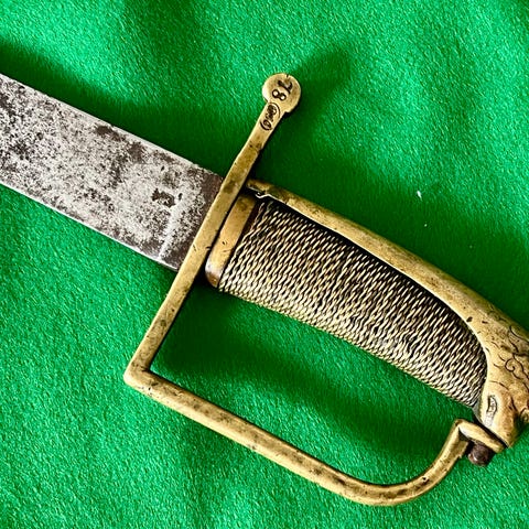 Engelsk tveegget kortsverd med skinnbalg. Doppsko og munnblikk i messing. Balg med hele sømmer.