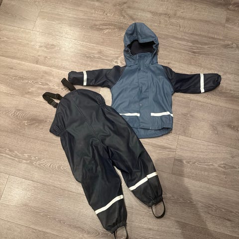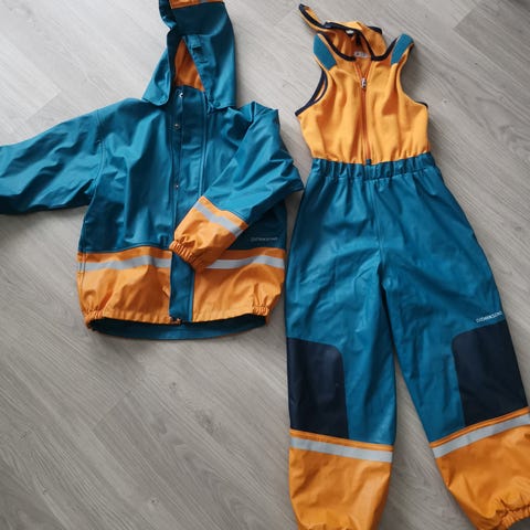Didriksons regnsett størrelse 130. Settet består av jakke med hette og selebukse i grå polyester. Materialet er vanntett, og både jakke og bukse har refleksdetaljer. Jakken har glidelås og trykknapper i front, samt fleecefôr på innsiden. Buksen har strikk nederst i bena for bedre passform. Gummistrikk under. Lite og pent brukt.