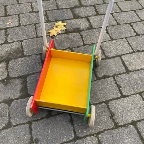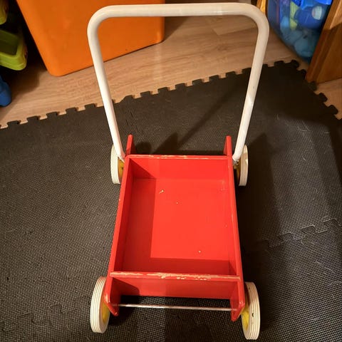 BRIO gåvogn i tre i klassisk rød og gul farge. Vognen har hvitt håndtak og fire hjul, samt åpen lasteflate til leker eller bamser. Egnet som støtte for små barn som øver på å gå, og som enkel leketralle innendørs. Laget i tre med solide plastdetaljer på hjul og håndtak.