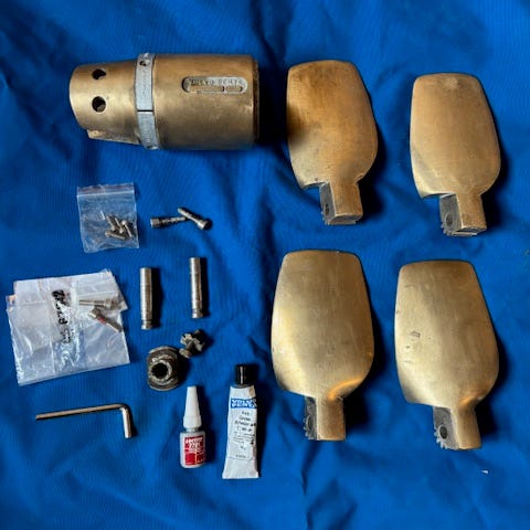 Propellen er ikke komplett. Det mangler splein til å feste akslingen i.