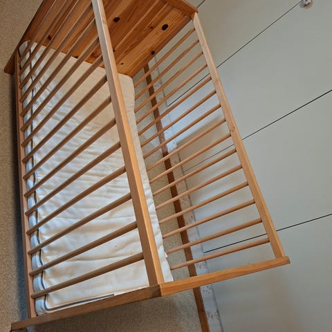 Den ene siden av sengen kan tas av når barnet kan klatre ut.