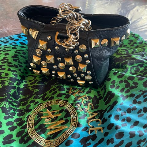 Versace for H&M skulderveske i svart kunstskinn for dame. Vesken har dekorative nagler og metallbeslag i gullfarge på forsiden, samt en kraftig lenkestropp i metall. Innvendig er den fôret med glatt stoff og har et åpent hovedrom uten synlige innerlommer. Lukkes med trykknapp. Egner seg som mindre skulderveske eller clutch til hverdagsbruk eller enklere penere anledninger.