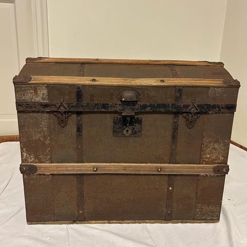 Amerikakiste i tre i brun farge. Kisten har buet lokk og metallbeslag. Innvendig er den lys trehvit. Egnet som oppbevaringskiste eller dekorativt møbel i hjem, bar eller butikk. Trekt med malt lerret. Brukt som narkose de siste årene.
