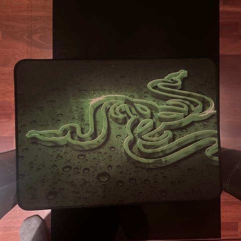 Razer musematte i rektangulær form. Oversiden har Razer-logo og motiv i grønn og svart, undersiden er ensfarget grønn. Kantene er sydd med svart kantbånd for økt holdbarhet. Egnet som tilleggsutstyr til datamaskin for bruk med optiske og laserbaserte mus.