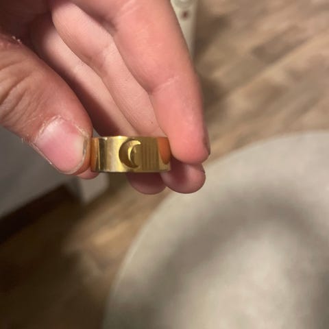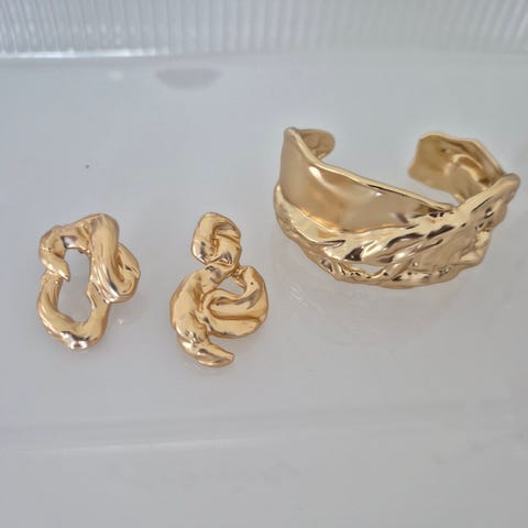 Armbånd i metall med gullfarge for dame. Armbåndet har flere rekker med ledd som danner en lenke med mønsteret «Murstein»Det lukkes med en rektangulær lås. Gammelt armbånd. Gammel arv.