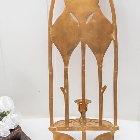søkeord: lysestake style innredning lyslykt messing vegglysestake dekor dekorasjon decoration decor hytte veggpynt gullfarget gullfarge gull romantisk messingstake messinglysestake landstil cottage core antikk stil lysholder cottagecore retro landlig hyttepynt gammel formet mønster druer drue klaser blad blader boligstyling lysestaker