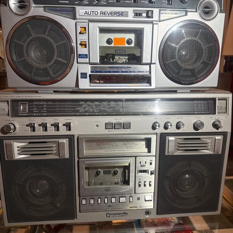 Panasonic RX-C36L med integrerte høyttalere. Enheten har frontplassert betjening med knapper, dreiehjul og equalizer. Denne er tatt service på. Kassettspiller byttet belter, avmagnetisert og satt riktig hastighet. Spiller fint med god lyd. Ettermontert bluetooth unit. Du kan streame musikk fra telefon eller nettbrett. Kan streame dab radio om du laster ned dab radio app. Kan spille musikk fra usb eller sd kort. God lyd fra bluetooth uniten. Sett volum på uniten på max, godt volum på telefonen, så styer du volum på boombox, fra telefonen eller medfølgende fjernkontroll. Volum på bluetooth uniten er satt på max ved salg. Legger ved en liten brukermanual sammen med fjernkontroll. Boomboxen er pen med lette bruksmerker. Bluetooth uniten slår seg på automatisk når strøm slås på. Kan slås av med fjernkontroll. Da kan line inngangen brukes til andre ting. Må stå på line inngangen når bluetooth uniten skal brukes. Det er equalizer på boombox, men også på bluetooth uniten. Velge mellom pop,rock, jazz. NB. Bluetooth uniten virker ikke på batteri da den er koblet til 220v.