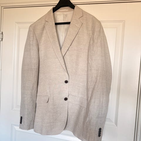 Dressmann blazer i lin for herre i størrelse L. Jakken er beige og laget av 100 % lin i ytterstoffet. Den har to knapper foran, slag, brystlomme og lommer nederst. Ermene har knapper nederst, og innsiden har foret innside med innerlomme. Passer som lett dressjakke eller blazer til både hverdagsbruk og mer formelle anledninger.