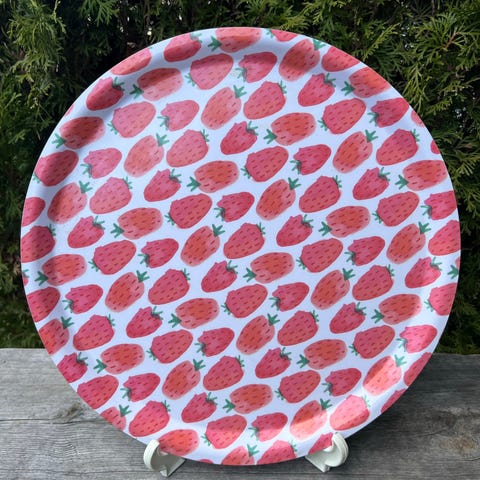 Sommerlig serveringsfat i metall med jordbærmotiv