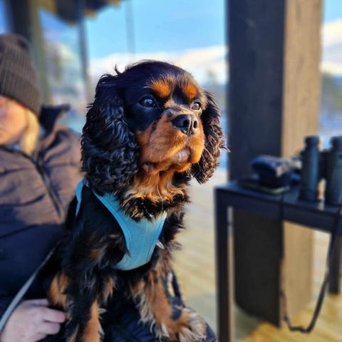 Det følger med blant annet reisebur, seng, masse hundemat og godbiter.