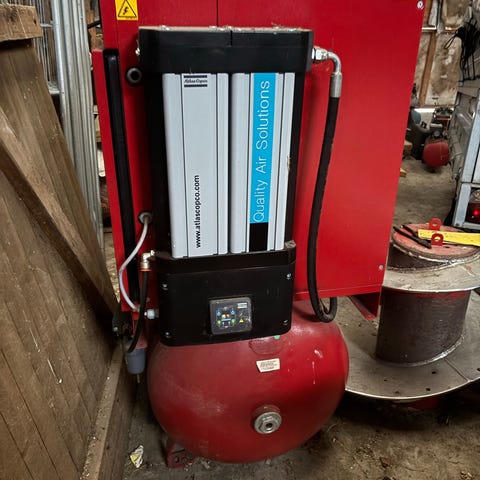 Modellen er en oljesmurt skruekompressor med integrert trykktank. Frontpanelet har manometer, driftstimeteller og betjeningsknapper. Maskinen er egnet for verksted- og industribruk der det er behov for stabil trykkluftforsyning. Kompressoren er bygget i stålkabinett og er konstruert for stasjonær installasjon innendørs. Detaljerte tekniske data som arbeidstrykk, luftmengde og effekt fremgår av typeskiltet på siden av kompressoren.