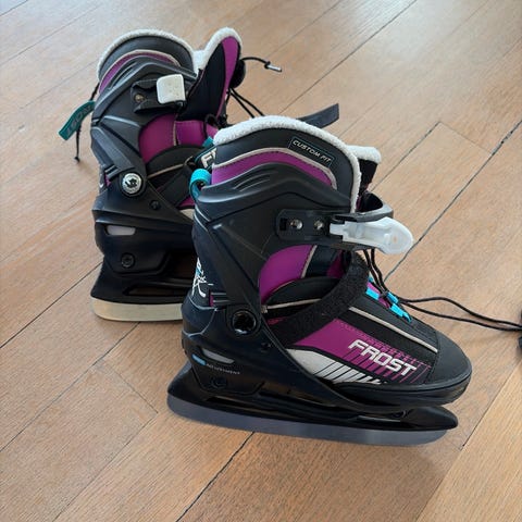 Firefly justerbare (str. 29-32) ishockeyskøyter for barn i svart og blå farge. Skøytene har justerbar størrelse via regulering på siden av skaftet. Overdelen er i syntetisk materiale med kombinasjon av snøring, borrelåsrem og spennelås for å gi god tilpasning rundt foten. Understellet er i plast med stålskinne som er egnet til ishockeybruk på isbaner. Passer til barn som trenger et par skøyter som kan justeres i størrelse over tid.