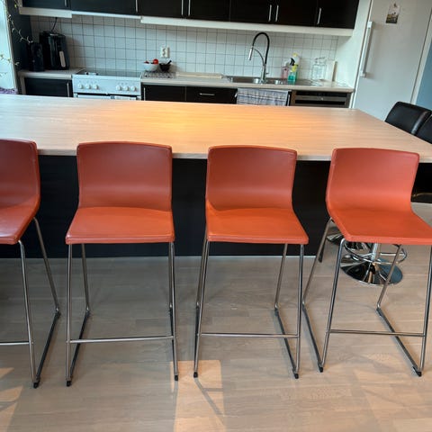 Selger fire IKEA Bernhard barkrakker. Pent brukt, ingen synlige merker, framstår som nye. De passer godt til kjøkkenøy, eller barbord, og har et moderne, stilrent uttrykk. Selges samlet kr.1000,-
