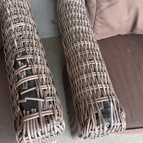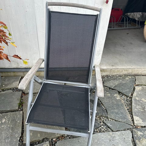 Solstol i buet design med liggefunksjon. Stolen har svart nettingtrekk og ramme i metall. Den leveres med avtakbar hodepute for ekstra støtte. Egnet til bruk på terrasse, platting eller i hage som liggestol for avslapping utendørs. Har noe skade under metall som står mot bakken, men er full brukbar.
