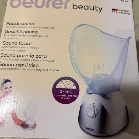 Ansiktsbastu for skjønnhetsbehandling samt innånding. Perfekt å bruke før du skal legge f.eks. en ansiktsmaske for å åpne opp porene. Dampforsterkning for innånding gjennom munn og nese, perfekt for å rense luftveiene ved f.eks. forkjølelse. Tilbehør for kosmetisk ansiktspleie samt damptilbehør for aromaapplikasjoner. Justerbar dampkontroll. Enkel rengjøring, målebeger for enkel fylling. Høykvalitativ avdunstingstank i aluminium.Størrelse: 20 x 30 cm. Effekt: 120 watt. Beurer Facial Sauna FS50