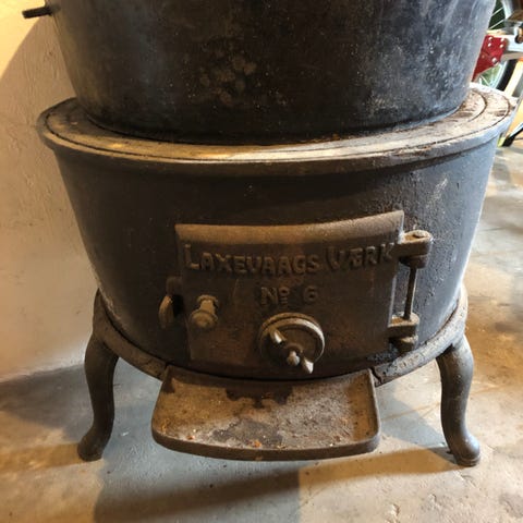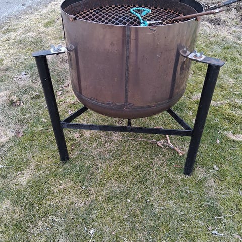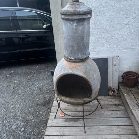 Støpejern bålpanne/ blomsterpotte med stativ i støpejern/metall, og overflaten har noe rust og værpåvirkning etter utendørs bruk.