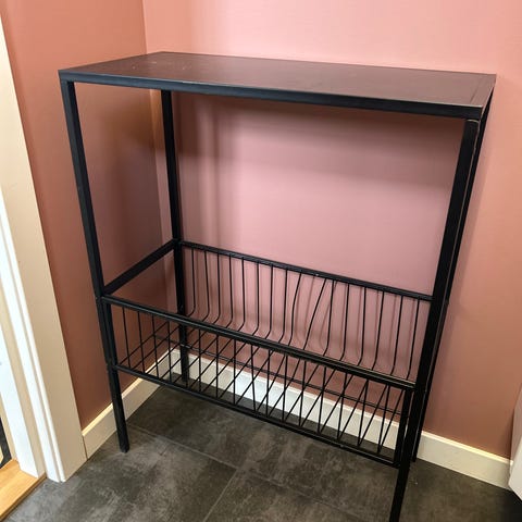 Stilren og praktisk hylle i sort metall. Passer perfekt til balkong, gang, bad, bod eller som dekorhylle.