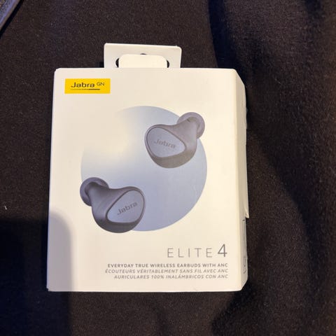 Jabra Elite Active 65t trådløse ørepropper i blå med ladeetui. God lyd med mye volum for størrelsen, og sitter godt i øret under trening. Etter egen erfaring holder batteriet på både selve øreproppene og ladeetuiet til flere timers lytting. Om ønskelig kan man skaffe nye, billige «propper» og bruke dem sammen med disse.
