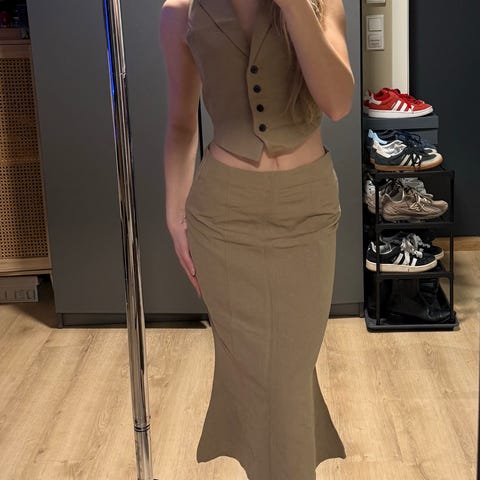 Kjempefint sett. Topp er str M . Skjørt er str xs. Begge deler passer fint xs. Sitter kjempefint på