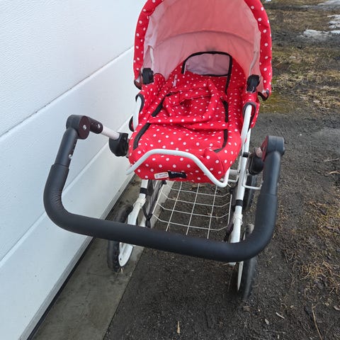 Den er godt brukt og håndtaket er tapet siden det holdt på å sprekke opp. Ellers er vognen hel og pen.