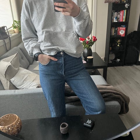 Levi's Ribcage Straight Ankle jeans for dame i blå denim. Buksen har midjemål W29 og er oppgitt i størrelse M. Modellen er en rett jeans med ankel-lengde. Materialet er klassisk denim som gir et stødig og slitesterkt uttrykk. Passer som hverdagsbukse og kan kombineres med ulike topper og gensere