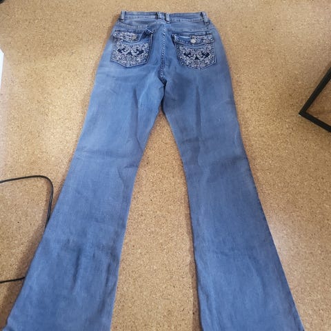 Måler 37 cm over livet, 76 cm innerbenslengde. Er noe stretch